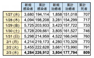 マレーシア保健省(MOH)は2月3日、新型コロナウイルス「Covid-19」の新規感染者数が前日から4,284人増加したと発表した。アクティブ感染者数は4万8,309人で、累計感染者数は22万6,912人となった。
