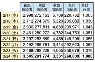 マレーシア保健省(MOH)は2月24日、新型コロナウイルス「Covid-19」の新規感染者数が前日から3,545人増加したと発表した。3日ぶりに3千人台となった。アクティブ感染者数は3万677人で、累計感染者数は29万1,774人となった。