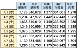 マレーシア保健省(MOH)は4月8日、新型コロナウイルス「Covid-19」の新規感染者数が前日から1,285人増加したと発表した。アクティブ感染者数は1万4,203人で、累計感染者数は35万5,753人となった。