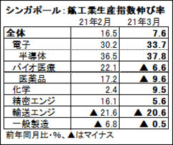 シンガポール経済開発庁(EDB)が4月26日発表した2021年3月の鉱工業生産指数(19年=100)は126.6となり、前年同月比で7.6%上昇した。指数上昇は5カ月連続。主力の電子(33.7%上昇)が好調に推移している。ただ、医薬品の落ち込みなどで伸び率は前月(16.5%上昇)から減速した。
