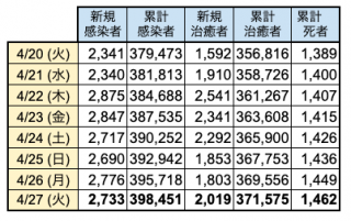 マレーシア保健省(MOH)は4月27日、新型コロナウイルス「Covid-19」の新規感染者数が前日から2,733人増加したと発表した。アクティブ感染者数は2万5,414人で、累計感染者数は39万8,451人となった。