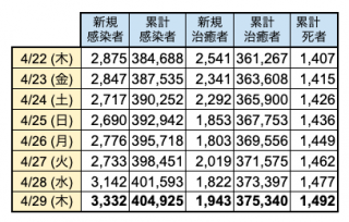 マレーシア保健省(MOH)は4月29日、新型コロナウイルス「Covid-19」の新規感染者数が前日から3,332人増加したと発表した。2日連続で3,000人を上回った。アクティブ感染者数は2万8,093人で、累計感染者数は40万4,925人となった。