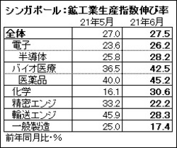 シンガポール経済開発庁(EDB)が7月26日発表した2021年6月の鉱工業生産指数(19年=100)は125.9となり、前年同月比で27.5%上昇した。指数の上昇は8カ月連続。前年同月は新型コロナウイルス対策で企業活動が低調だったため、反動で大幅な伸びとなった。季節調整済みの前月比では3.0%低下した。