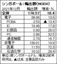 シンガポール企業庁が1月17日発表した2021年12月の輸出額(石油と再輸出を除くNODX)は、前年同月比で18.4%増加し、単月で過去最高となる178億5,713万Sドル(約1兆5,200億円)に拡大した。プラス成長は13ヵ月連続。伸び率は前月の24.2%から縮小したものの、2割前後の増加が続いている。最大の電子製品が2桁増を維持したほか、医薬品が大きく伸びた。