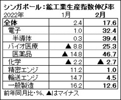 シンガポール経済開発庁(EDB)が3月25日発表した2022年2月の鉱工業生産指数(19年=100)は121.1となり、前年同月比で17.6%上昇した。前年同月を上回るのは5ヵ月連続で、前月から伸びが加速。半導体(39.4%上昇)の好調で主力の電子(32.4%上昇)が大きく伸びた。