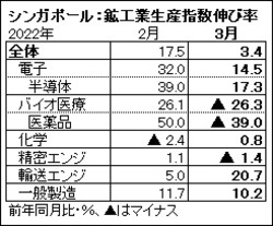 シンガポール経済開発庁(EDB)が4月26日発表した2022年3月の鉱工業生産指数(19年=100)は133.0となり、前年同月比で3.4%上昇した。前年同月を上回るのは6カ月連続となる。ただ、バイオ医療(26.3%低下)が大きく落ち込み、上昇率は前月(17.5上昇)から減速した。