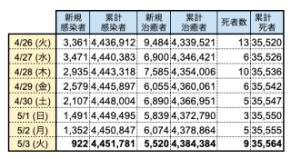 新型コロナウイルス「Covid-19」感染症に関する情報提供サイト「コビドナウ(COVIDNOW)」によると、5月3日の新型コロナウイルス「Covid-19」の新規感染者数は922人だった。今年初めて1,000人を下回った。累計感染者数は445万1,781人だった。