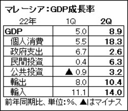 マレーシア中央銀行は8月12日、2022年第2四半期の実質国内総生産(GDP)成長率が前年同期比8.9%だったと発表した。3四半期連続のプラスで、伸び率は前四半期の5.0%から加速。前年は新型コロナウイルス流行で6月から全国的な活動制限令(MCO)が敷かれたことで冷え込んでおり、大幅な反動増となった。