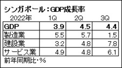 シンガポール貿易産業省は10月14日、2022年第3四半期の実質国内総生産(GDP、速報値)成長率を前年同期比4.4%と発表した。第2四半期の4.5%(改定値)を下回り、2四半期ぶりに減速。新型コロナウイルス沈静化に伴う4月からの入国規制緩和によりサービス業が伸びた一方、世界的な物価高と金融正常化の影響で製造業が減速した。