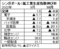 シンガポール経済開発庁(EDB)が11月25日発表した2022年10月の鉱工業生産指数(19年=100)は123.3となり、前年同月比で0.8%低下した。前年同月を下回るのは21年9月以来、13カ月ぶり。主力の電子(0.7%低下)が4カ月連続の前年割れとなったほか、前年同月に急伸していたバイオ医療(14.5%低下)が大きく落ち込んだ。ただ、季節調整済みの前月比では全体で0.9%上昇し、バイオ医療を除くと横ばいだった。