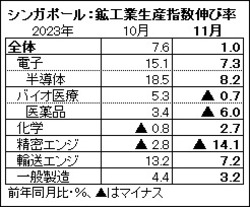 シンガポール経済開発庁(EDB)が26日発表した2023年11月の鉱工業生産指数(19年=100)は118.5となり、前年同月比で1.0%上昇した。