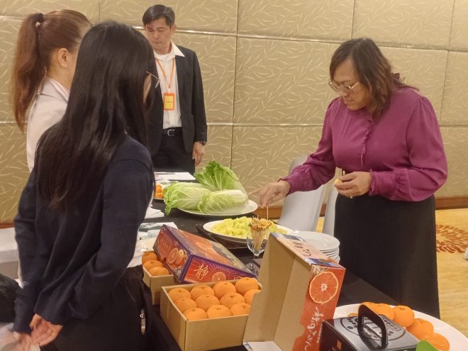 今回の試食商談会には、日本産の果物や加工品を取り扱う▽阪東食品▽全農インターナショナル▽静岡県経済農業協同組合連合会▽富永商事――の4社が参加。阪東食品はバカスコ(ペッパーソース)、すだち&きゅうりシロップ、全農インターナショナルは山形リンゴ、紅ほっぺ(イチゴ)、きらぴ香(いちご)、静岡県経済農業協同組合連合会は緑茶商品とクラウンメロン、温州みかん、キンカン、ミニ白菜、富永商事は長芋、甘薯、イチゴ、カボチャ、リンゴを出品した。